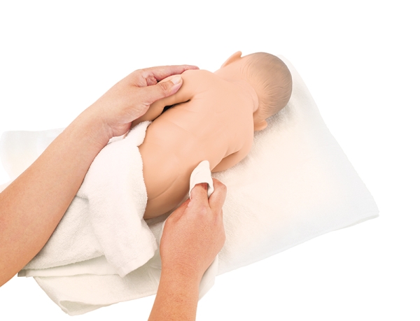 Eine sehr wirklichkeitsnahe Nachbildung eines Neugeborenen. Durch die Verwendung von speziellem Kunststoff fühlt sich die Haut sehr natürlich an. Die Gewichtung entspricht den normalen Gegebenheiten. Vordere und hintere Fontanelle sowie Sutura coronalis und sagittallis sind sorgfältig nachgebildet und tastbar. Der Kopf kippt weg, wenn er nicht richtig gehalten wird. Die Wirbelsäule und die beweglichen Hoden sind tastbar. Der Nasenraum, die Mundhöhle und der Magen können abgesaugt werden. Im 5 cm tiefen Analkanal kann das Messen der Körpertemperatur geübt werden. Durch die völlig nahtfreie Herstellung ist das Modell absolut wasserdicht und kann bedenkenlos für Badeübungen eingesetzt werden. Der Nabelrest ermöglicht die Demonstration und das Üben der Nabelpflege und ist einfach abnehmbar. Eine Verwendung für die Demonstration von krankengymnastischen Übungen (Vojta, Bobath) ist durch die flexiblen Arme und Beine sehr gut möglich. Natürlich können auch allgemeine Untersuchungen wie z.B. das Vermessen praktiziert werden. Auch das Anlegen von Windeln und das Anziehen kann geübt werden. Die Lieferung erfolgt in einer Aufbewahrungstasche.