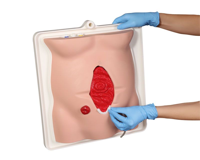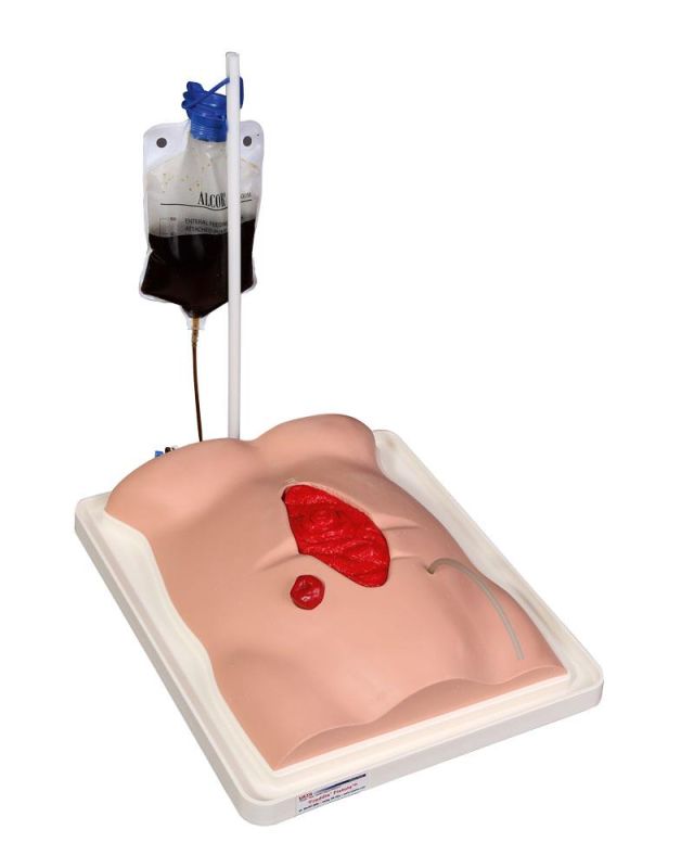 Freddie Fistula wurde entwickelt um Pflegekräften und medizinischen Ausbildern ein Übungsmodell zu bieten, mit dem effektiv das Wundmanagement von abdominalen Wunden mit aktiven Fisteln unterrichtet und geübt werden kann. Offene Abdominalwunden mit aktiv Flüssigkeit absondernden Fisteln stellen eine komplexe Herausforderung bei der Wundversorgung dar, die verschiedenste Behandlungsmodalitäten erfordert, um den Fistelausfluss zu kontrollieren und optimale Wundheilung zu gewährleisten. Der Freddie Fistula Wundversorgungs-Trainer beinhaltet innovatives Design und eine realistische offene Abdominalwunde mit freiliegendem Darm und drei aktiv Flüssigkeit abscheidenden Fisteln. Eine zentrale, stomatisierte Fistel ist leicht zu erkennen während die nicht stomatisierte und die versteckte Fistel nicht sofort zu erkennen sind und die Komplexität des Auffindens der Quelle der Flüssigkeitsabsonderung erhöhen, so dass es schwieriger ist, die Drainage unter Anwendung verschiedener Verbandmaterialien und –techniken (wie z.B. Vakkumtherapie) zu managen. Jede Kombination der drei Fisteln kann geöffnet werden, um Ausfluss zu erzeugen. Der Sockel des Modells ist als Schale angelegt, welche bis zu 700ml Flüssigkeit aufnehmen kann. Der Freddie Fistula Trainer hilft Kompetenz und Vertrauen aufzubauen in diesem anspruchsvollen Szenario und erlaubt es dem Übenden, einige der neuesten Wundbehandlungen und Techniken anzuwenden. Im Lieferumfang des Freddie Fistula Trainers ist ein Stativ für den 500 ml Reservoirbeutel, ein Drainageschlauch, eine Flasche mit künstlichem Sekret und ein 3-Wege-Schlauchset mit Farbcodierung und Absperrklemmen enthalten