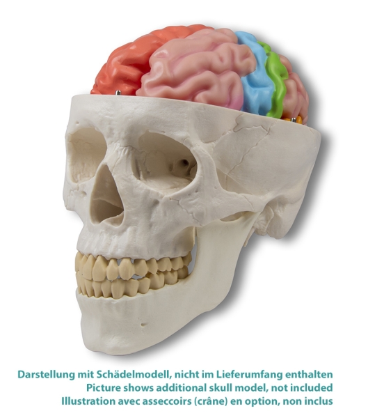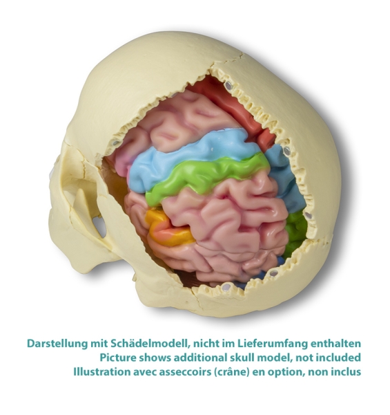 Dieses lebensgroße Gehirnmodell präsentiert die zentralen Landmarken und Hirnrindenregionen in aufwendiger, farbiger Darstellung. Auf der rechten Hälfte sind die vier Gehirnlappen deutlich differenziert: Stirn-, Seiten-, Schläfen- und Hinterhauptslappen. Die linke Hälfte ist in vier Teile zerlegbar, darunter Stirn-, Seiten-, Schläfen- und Hinterhauptslappen sowie Hirnstamm und Kleinhirn. Die präzise Bemalung ermöglicht die klare Identifikation der fünf Hirnrindenareale – motorische Rinde, sensible Rinde, Sehrinde, Motorisches Sprachzentrum (Broca-Areal), Hörrinde und Wernicke-Zentrum. Dieses Modell ist mit den Schädelmodellen Art.Nr. 4500, 4505, 4508, 4509, 4512, 4514, 4701 und 4708 kompatibel und lässt sich zudem mit dem Falx cerebri Modell Art.Nr. C925 kombinieren.