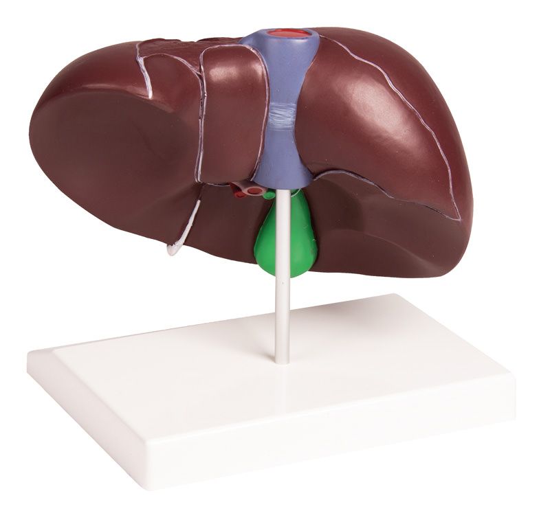Dieses Modell zeigt die Leber zusammen mit der Gallenblase. Dargestellt sind die Hilusgefäße ebenso wie die extrahepatischen Gange und die wichtigsten Ligamente. Mit abnehmbarem Stativ.