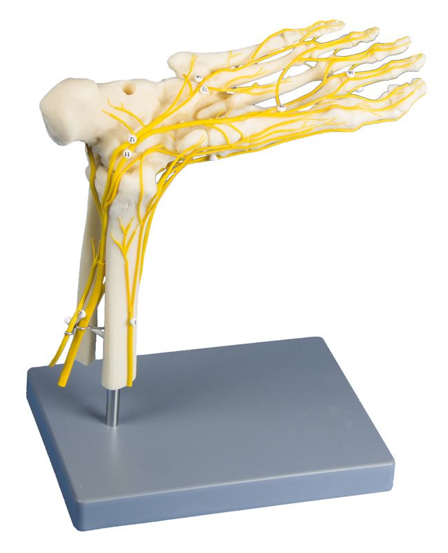 Entdecken Sie ein lebensgroßes Modell des rechten Fußes, das alle wesentlichen Nerven in eindrucksvoller Genauigkeit darstellt. Sowohl die Nerven auf der Oberseite des Fußes als auch diejenigen auf der Fußsohle sind detailreich dargestellt, um ein umfassendes Verständnis der Fußanatomie zu ermöglichen.
