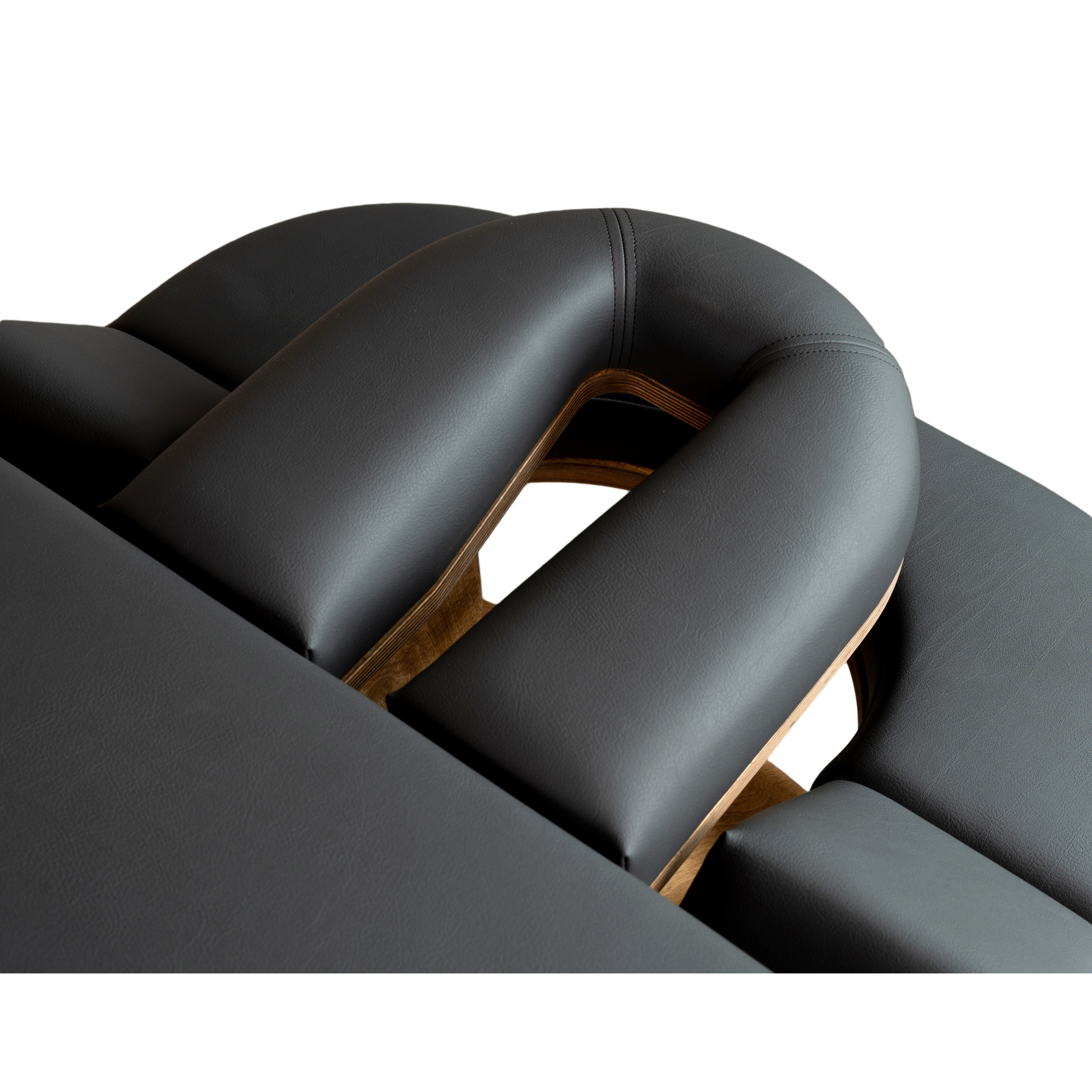 Das patentierte Kopfteil mit integrierter, absenkbarer Armablage sorgt für höchsten Komfort in der Bauchlage. Die bequeme Positionierung der Arme trägt zu einer entspannten und angenehmen Liegeerfahrung bei, was besonders bei längeren Behandlungen von Vorteil ist.