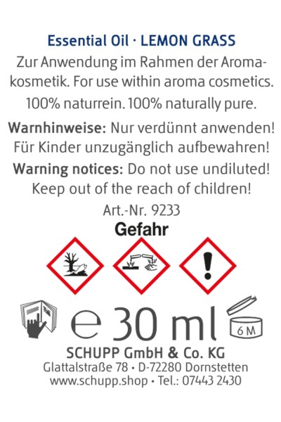 Hinweis zur Anwendung: Ätherische Öle sollten stets verdünnt angewendet werden. Vermeiden Sie direkten Kontakt mit den Augen und halten Sie das Produkt außerhalb der Reichweite von Kindern. Entdecken Sie die revitalisierende Wirkung von SCHUPP Ätherischem Öl Lemongras und gönnen Sie sich und Ihren Gästen eine erfrischende Auszeit vom Alltag.