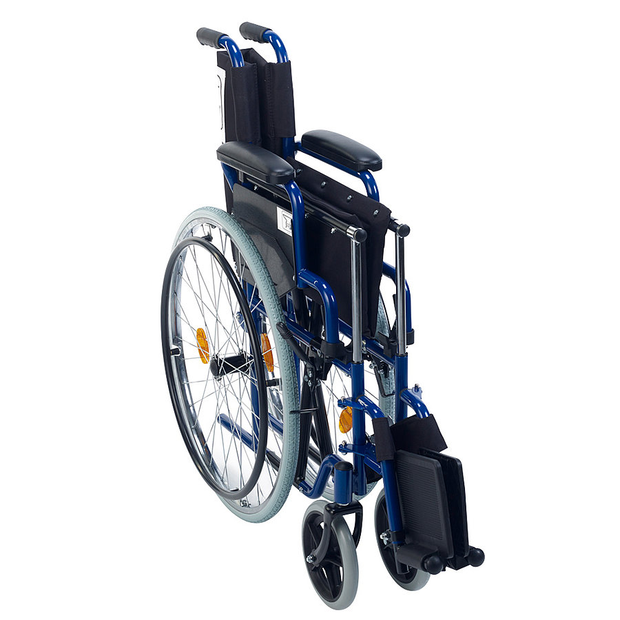 Wenn der Rollstuhl nicht benötigt wird, kann er platzsparend zusammengeklappt und verstaut werden. Die Sitzfläche und die Rückenlehne bestehen aus robustem und langlebigem Material. Die Fußstützen können gekippt, geschwenkt und entfernt werden, um den individuellen Bedürfnissen anzupassen. Reflektoren sorgen für Sicherheit bei der Verwendung in der Dunkelheit.